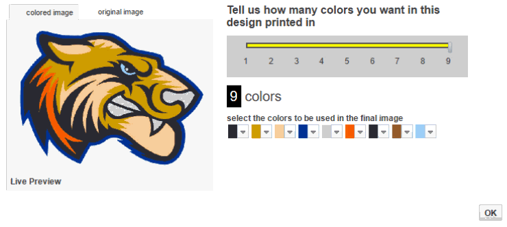 顧客のアップロードやコレクションからの選択は、デザイナー内で動的に再現することができます。 DecoNetworkは最大スクリーンプリント色の設定に合わせて自動的に色数を減らし、お客様がデザインの色を変更したり変更したりすることができます。